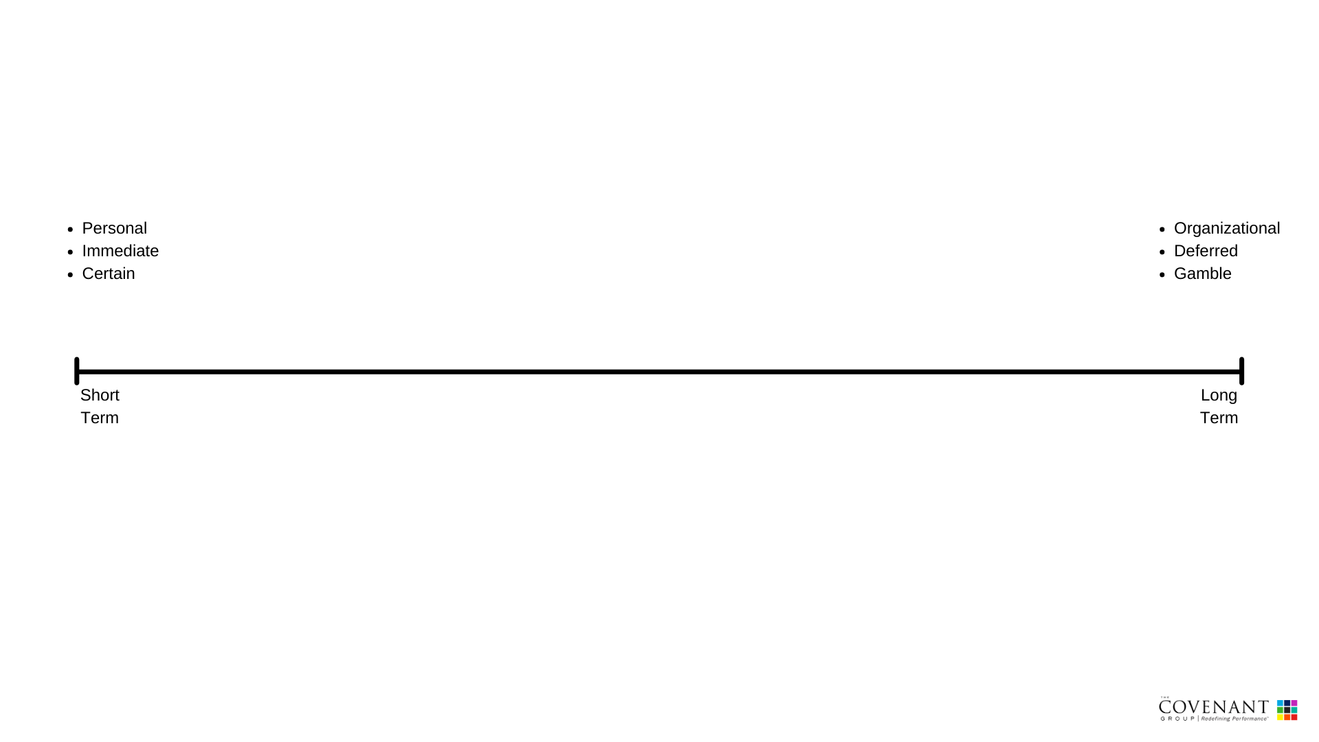 We are all motivated to do what is personal, immediate, and certain. The things that are most likely to redefine our performance are organizational, deferred and a gamble.