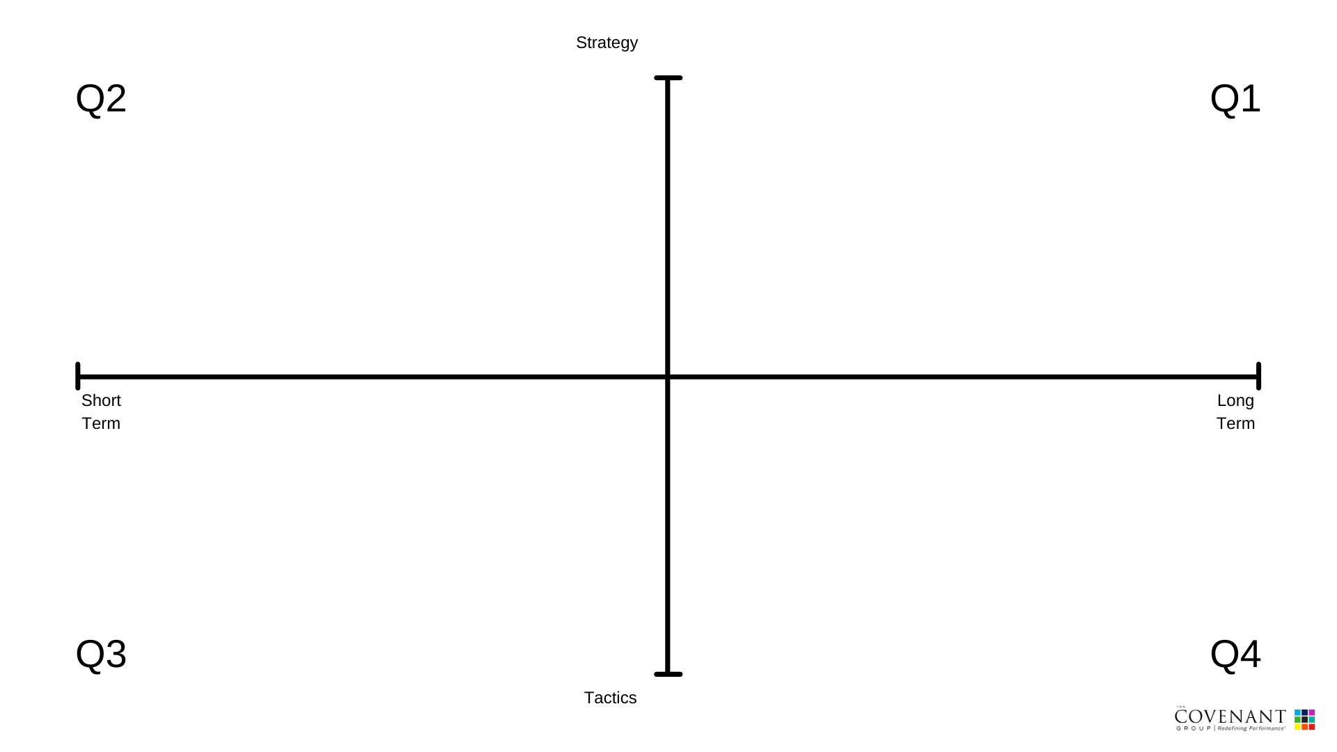 The future drives the present. In our first session, we discussed the Performance Quadrant. The quadrant's goal is to align the short term tactical aspects of your business with the long the term strategic objectives of your business. To do so, we need to examine each quadrant, starting with the longest task in which you are involved. We then work to connect this with the short complex tasks in which you are involved. The goal is to align the strategic and tactical.
