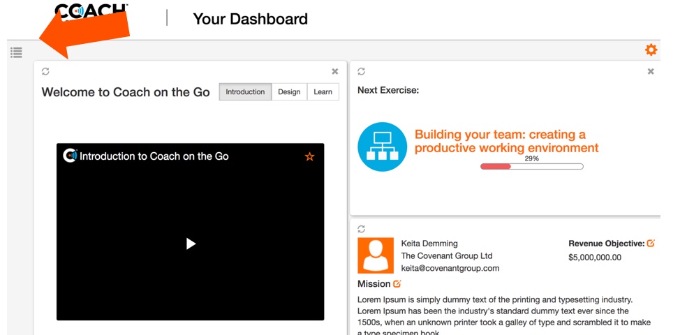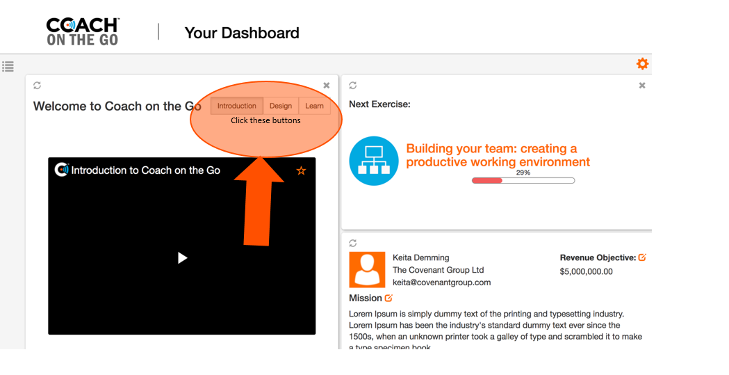 When you login to Coach on The Go™, start by watching the three videos on your dashboard. They are titled Introduction, Design, and Learn. These videos are designed to orient you within the platform and will introduce you to the language philosophy and approach taken throughout Coach on The Go™. The image below shows you where to find the videos. Once you have watched these videos feel free to explore Coach on The Go, but do not try to do all the exercise in the platform. Redefining performance is a process and you are just at the beginning.